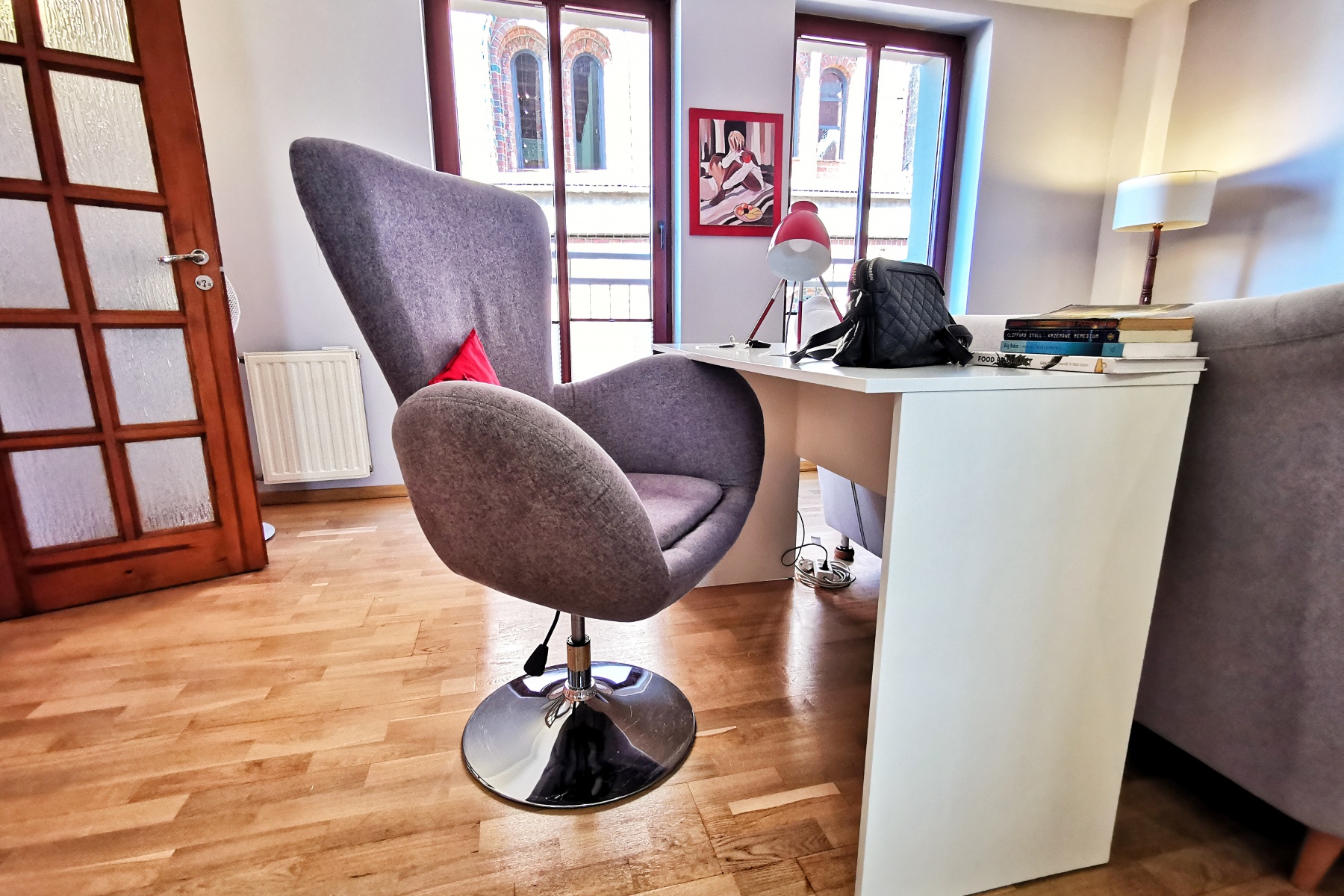 Klimatyczny apartament zlokalizowany na II piętrze kamienicy na Starym Mieście, z pięknym widokiem na Rynek Sienny i ratusz. W apartamencie znajdują się dwie sypialnie, jedna z podwójnym łóżkiem a druga z dwoma łóżkami pojedynczymi. Otwarta kuchnia jest wyposażona we wszystkie sprzęty codziennej potrzeby tj. lodówka, kuchenka elektryczna, piekarnik, zmywarka, ekspres do kawy, czajnik, mikrofalówka oraz niezbędne przybory do gotowania. Apartament posiada także balkon od strony podwórza. W łazience znajduje się wanna, osobny prysznic oraz pralka.