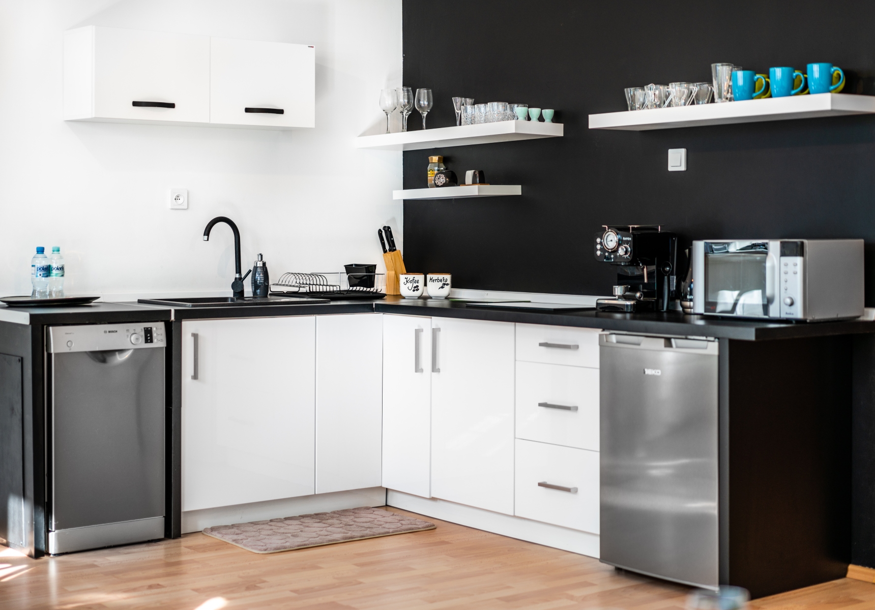 Kuchnia w formie aneksu kuchennego ze wszystkimi przyborami oraz sprzętami codziennego użytku: czajnik, ekspres do kawy, kuchenka elektryczna, zmywarka, mikrofalówka. Łazienka z prysznicem i pralką.